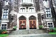 It is three storeys tall, and is made in the neo-Tudor style of sandstone lined with Indiana freestone.[3] Made of sandstone are the Gothic details, the crenellated, square tower, the four corner turrets at the sides, the buttresses supporting the two wings, as well as the oriel window located above the ogival doors.[1] It is similar to Westmount City Hall in that both have a Tudor influence.[3]