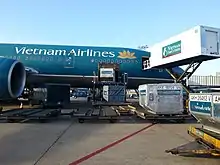 A Vietnam Airlines Boeing 777-200ER being catered by Vietnam Air Caterers (since renamed Vietnam Airlines Caterers) at Tan Son Nhat International Airport.