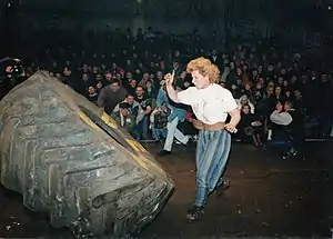 In 2000, for the first time in Ukraine, on a par with men, Viktoria takes part in the Strongman tournament "Bohatyrski Rozvagy".[10] She was the only woman in this tournament. In these competitions, Viktoria won the title "The strongest woman in Ukraine".[11] The athlete has performed a dump truck wheel flip three times in 26 seconds. Wheel weight was 340 kg.