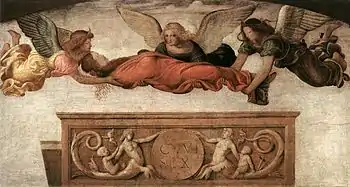 The Villa La Pelucca frescoes are a c. 1520–1523 cycle of frescos by Bernardino Luini, commissioned by the Milanese nobleman Gerolamo Rabia for his villa near Monza, known as 'La Pelucca'. Most of the surviving fragments are in the Pinacoteca di Brera in Milan, though others are in the Wallace Collection in London, the Louvre in Paris, the Musée Condé in Chantilly and other private collections.[1] Stylistically they shown the influence of Bramantino - Women Bathing the figure's shoulders is a homage to the Trivulzio Tapestries, particularly February from that cycle.