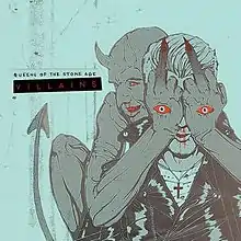 The cover art for Villains was designed by graphic artist Boneface, who designed the artwork for Queens of the Stone Age's previous album, ...Like Clockwork.[11] It was the first time that the band had returned to an artist to request artwork on a subsequent album. In an interview with the Juxtapoz magazine, Boneface talked about returning to create a cover for the album and his working relationship with Josh Homme. In the article he stated that, "Returning was honestly a pretty daunting task. People seemed to like all the artwork I did for the last album, so I felt I had something to live up to. Also, the fact that QOTSA tend to use a different artist for each album cover made it kind of special that they decided to use me again. I think Josh likened our relationship to Hunter S. Thompson and Ralph Steadman in the initial rallying call. So after I’d decided to plunge back into the QOTSA jacuzzi, I started work the way I usually do, just trying to create something cool. I did a bunch of preliminary drawings before I’d heard any new songs or we’d even talk about the album, and one of those sketches actually ended up being the basis for the album cover."[12] Each band member was given their own artwork, with Homme's on the front cover, and the rest of the band members on the back. An alternate vinyl cover that was released exclusively through independent record stores had a light blue tint over the image, gave Josh Homme a bloody nose, and the devil behind Homme giving two middle fingers.