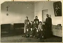 A group of students at the school sometime between 1921 and 1930. Portrait of Grand Duke Vytautas hangs on the wall.