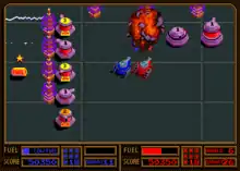 Between levels, the player is taken to a shop where items and upgrades to tank speed, power, etc. may be purchased with stars. Any damage caused to the player's tank will decrease the shield level. Purchasing a shield drastically reduces damage down to a mere pixel worth of the fuel gauge per hit. When the fuel depletes, the speed of the tank is reduced to a crawl and a countdown begins from 10. If no fuel is gained before the timer reaches zero, or if the player is shot during the countdown, the tank explodes and a life is lost.