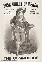 Cameron then moved to the Strand Theatre, where she appeared in Farnie's burlesque, Nemesis and then played Suzanne in his translation of Offenbach's Madame Favart (1879). In 1881, she moved to Alexander Henderson's Comedy Theatre, where she sang the title role in Edmond Audran's The Mascot and had another great success in 1882 as Gretchen in Planquette's Rip Van Winkle. In 1883, she sang the title roles in Von Suppé's Boccaccio and Chassaigne's Falka. This was followed by other light operas at the Comedy. In 1885, she was engaged at the Avenue Theatre, where she played the lead in Bad Boys, an adaptation of the French piece Clara Soleil, and created the role of Dudley in Reece and Farnie's Kenilworth. The following year, she created the title role in Farnie's burlesque of Lurline.[5][3]
