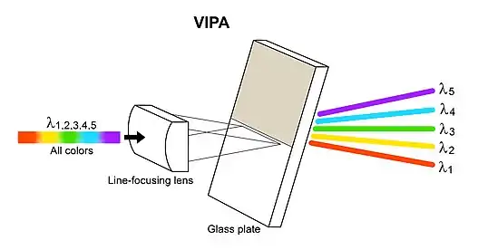 A virtually imaged phased array (VIPA) is an angular dispersive device that, like a prism or a diffraction grating, splits light into its spectral components. The device works almost independently of polarization. In contrast to prisms or regular diffraction gratings, the VIPA has a much higher angular dispersion but has a smaller free spectral range. This aspect is similar to that of an Echelle grating, since it also uses high diffraction orders. To overcome this disadvantage, the VIPA can be combined with a diffraction grating. The VIPA is a compact spectral disperser with high wavelength resolving power.