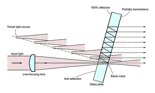 The main component of a VIPA is a glass plate whose normal is slightly tilted with respect to the input light. One side (light input side) of the glass plate is coated with a 100% reflective mirror and the other side (light output side) is coated with a highly reflective but partially transmissive mirror. The side with the 100% reflective mirror has an anti-reflection coated light entrance area, through which a light beam enters the glass plate. The input light is line-focused to a line (focal line) on the partially transmissive mirror on the light output side. A typical line-focusing lens is a cylindrical lens, which is also part of the VIPA. The light beam is diverging after the beam waist located at the line-focused position.