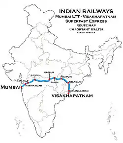 - ↑ "22847/Visakhapatnam - Mumbai LTT SF Express (via Nagpur) - Visakhapatnam to Lokmanya Tilak Terminus ECoR/East Coast Zone - Railway Enquiry". indiarailinfo.com. Retrieved 25 August 2021.