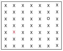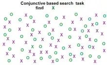 Conjunction search (also known as inefficient or serial search)[6] is a visual search process that focuses on identifying a previously requested target surrounded by distractors possessing no distinct features from the target itself.[10] An example of a conjunction search task is having a person identify a red X (target) amongst distractors composed of black Xs (same shape) and red Os (same color).[10] Unlike feature search, conjunction search involves distractors (or groups of distractors) that may differ from each other but exhibit at least one common feature with the target.[10] The efficiency of conjunction search in regards to reaction time (RT) and accuracy is dependent on the distractor-ratio[10] and the number of distractors present.[7] As the distractors represent the differing individual features of the target more equally amongst themselves (distractor-ratio effect), reaction time(RT) increases and accuracy decreases.[10] As the number of distractors present increases, the reaction time (RT) increases and the accuracy decreases.[6] However, with practice the original reaction time (RT) restraints of conjunction search tend to show improvement.[11] In the early stages of processing, conjunction search utilizes bottom-up processes to identify pre-specified features amongst the stimuli.[7] These processes are then overtaken by a more serial process of consciously evaluating the indicated features of the stimuli[7] in order to properly allocate one's focal spatial attention towards the stimulus that most accurately represents the target.[12]
