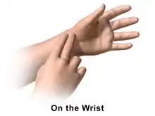 The pulse is the rate at which the heart beats while pumping blood through the arteries, recorded as beats per minute (bpm).[13] It may also be called "heart rate". In addition to providing the heart rate, the pulse should also be evaluated for strength and obvious rhythm abnormalities.[13] The pulse is commonly taken at the wrist (radial artery). Alternative sites include the elbow (brachial artery), the neck (carotid artery), behind the knee (popliteal artery), or in the foot (dorsalis pedis or posterior tibial arteries).[13] The pulse is taken with the index finger and middle finger by pushing with firm yet gentle pressure at the locations described above, and counting the beats felt per 60 seconds (or per 30 seconds and multiplying by two).[13] The pulse rate can also be measured by listening directly to the heartbeat using a stethoscope. The pulse may vary due to exercise, fitness level, disease, emotions, and medications.[13] The pulse also varies with age. A newborn can have a heart rate of 100–160 bpm, an infant (0–5 months old) a heart rate of 90–150 bpm, and a toddler (6–12 months old) a heart rate of 80–140 bpm.[14] A child aged 1–3 years old can have a heart rate of 80–130 bpm, a child aged 3–5 years old a heart rate of 80–120 bpm, an older child (age of 6–10) a heart rate of 70–110 bpm, and an adolescent (age 11–14) a heart rate of 60–105 bpm.[14] An adult (age 15+) can have a heart rate of 60–100 bpm.[16]