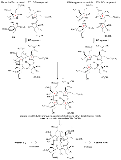The A/B approach to the cobyric acid syntheses was collaboratively pursued and accomplished in 1972 at Harvard. It combined a bicyclic Harvard A-D-component with an ETH B-C-component, and closed the macrocyclic corrin ring between rings A and B.[3]: 145,176 [4]: 0:36:25-0:37:37 The A/D approach to the synthesis, accomplished at ETH and finished at the same time as the A/B approach also in 1972, successively adds rings D and A to the B-C-component of the A/B approach and attains the corrin ring closure between rings A and D.[10][11][12] The paths of the two syntheses met in a common corrinoid intermediate.[11]: 519 [38]: 172 The final steps from this intermediate to cobyric acid were carried out in the two laboratories again collaboratively, each group working with material prepared via their own approach, respectively.[17]: 33 [18]: 1567