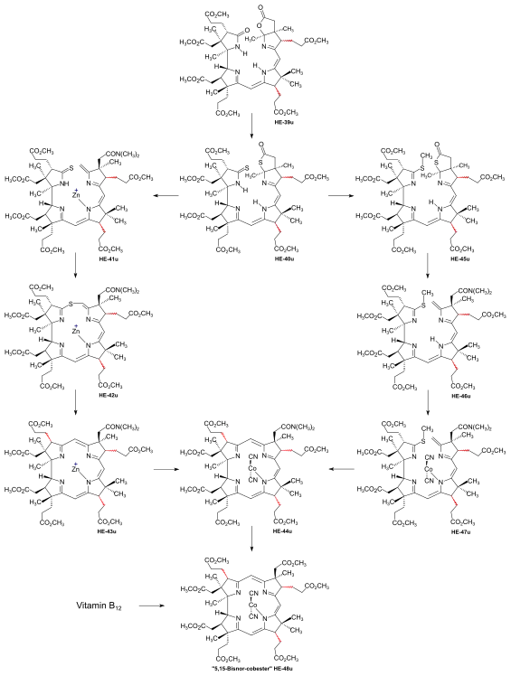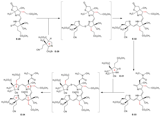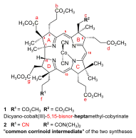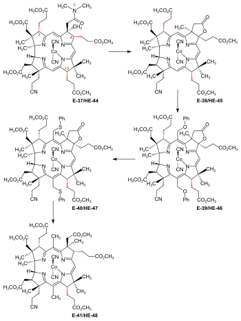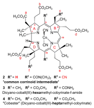 - ↑ See Synthesis of dicyano-cobalt(III)-5,15-bisnor-a,b,d,e,g-pentamethyl-cobyrinate-c-N,N-dimethylamide-f-nitrile (the common corrinoid intermediate) from the ring-D-differentiated A-D-component in (Show/Hide) "Coupling of Harvard A-D-components with the ETH B-C-component".