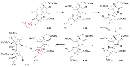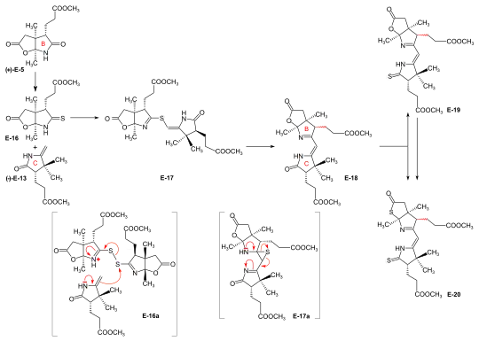 In this advanced model study, reaction conditions for the demanding processes of the C/D-coupling and the A/B-cyclization via sulfide contraction method were established. Those for the C/D-coupling were successfully explored in both laboratories, the superior conditions were those found at Harvard,[2]: 290-292 [18]: 1562 while the method for the A/B-ring closure via an intramolecular version of the sulfide contraction[46][36][47] was developed at ETH.[2]: 297-299 [48][18]: 1562-1564 Later it was shown at Harvard that the A/B-ring closure could also be achieved by thio-iminoester/enamine condensation.[2]: 299-300 [18]: 1564