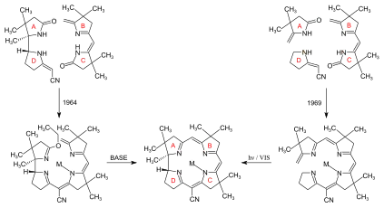 - ↑ The year 1964 refers to the first corrin synthesis of a pentamethylcorrin via A/B-cyclization by iminoester/enamine-C,C-condensation;[28] the heptamethylcorrin shown here (M = Co(CN)2) was prepared by the same ring closure method in 1967.[29]