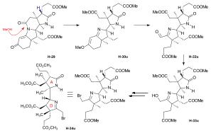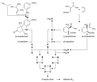 - ↑ References given here are a selection from more than 60 publications where these epochal syntheses are discussed in more or less detail. They are also used to teach natural product synthesis in advanced courses or research group seminars, e.g., Eschenmoser, A. (2001). "Epilogue: Synthesis of Coenzyme B12: A Vehicle for the Teaching of Organic Synthesis". In Quinkert, Gerhard; Kisakürek, M. Volkan (eds.). Essays in Contemporary Chemistry: From Molecular Structure Towards Biology. Zürich: Verlag Helvetica Chimica Acta. pp. 391–441. doi:10.1002/9783906390451.ch12. ISBN 9783906390284. free version: Eschenmoser, Albert (2015). "Synthesen von Vitamin B12 (an die Hörer verteilte Unterlagen, Sommersemester 1973)". doi:10.3929/ethz-a-010521002. Retrieved 2023-11-08.