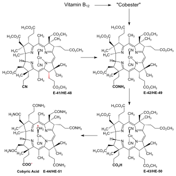 - 1 2 3 4 5 Cobester (dicyano-Co-cobyrinic acid heptamethylester) is a non-natural cobyric acid derivative that had played an important subsidiary role in the B12 total syntheses;[55]: 14,21,51–90,222–260 it is prepared in one step from vitamin B12 by acid-catalyzed methanolysis.[56]: 9–18