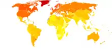 The prevalence of MS is associated with latitude. In this image, red indicates a high prevalence of MS while yellow indicates a lower prevalence