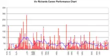 Richards made his test debut in 1974 against India along with Gordon Greenidge. His best years were between 1976 and 1983 where he averaged a remarkable 66.51 with the bat in test cricket. In 1984 he suffered from pterygium and had eye surgery[13] which affected his eyesight and reflexes.[14] Despite this, he remained the best batsman in the world for the next four years, averaging 50. His form declined in the latter years of his career where he averaged 36. Overall, Richards scored 8,540 runs in 121 Test matches at an average of 50.23 and retired as then West Indies leading run scorer overhauling the aggregate of Garfield Sobers.[15] He also scored 1281 runs at an average of over 55 in World Series Cricket, which is regarded as the highest and most difficult level of cricket ever played.[16] As a captain, he won 27 of 50 Test matches and lost only 8. He also scored nearly 7,000 runs in One Day Internationals and more than 36,000 in first-class cricket.