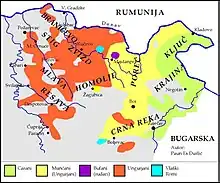 There are hypotheses about an autochthonous origin of the Vlachs in the area in which they currently live. Researchers who promoted this idea include the researcher Atanasie Popovici, a native of the area.[6] However, most researchers agree that the Vlachs of eastern Serbia originate from areas in present-day Romania and settled in land in which they live today as a result of migrations in the 18th and 19th centuries.[6][7] These migrations occurred due to the difficult living conditions in Hungary, Moldavia and Wallachia.[8] Strong migrations were recorded between 1718 and 1739 after the Austro-Turkish War of 1716–1718; during this time, eastern Serbia was part of the Banat of Temeswar. Migrations to eastern Serbia continued after this period, albeit on a smaller scale.[6] More precisely, migrations were recorded in the periods of 1723–1725, 1733–1734, 1818 and 1834. These were directed to the settlements of Jošanica, Krepoljin, Laznica (Laznița), Osanica, Ribare, Suvi Do, Vukovac, Žagubica (Jagubița or Jăgobița). These migrations increased the number of houses in the area around the Homolje Mountains (Serbian: Хомољске планине / Homoljske planine; Romanian: Munții Homolie or Munții Homoliei) from 80 in 1718 to 155 in 1733. Furthermore, the two latter waves led to the foundation of the settlements of Bliznak, Breznica, Izvarica, Jasikovo, Krupaja, Milanovac and Sige. According to the place of origin of these new migrants, the Vlachs of eastern Serbia were divided into ungureni (originating from the Kingdom of Hungary, or more precisely, from Banat and Transylvania proper) and țărani (originating from Moldavia and Wallachia).[8] The Vlachs are still divided into these two groups according to the Romanian dialect they speak; the ungureni have a speech closely related to the Banat Romanian dialect while the dialect of the țărani is closer to the Wallachian one. Dialectally, there are two other groups of Vlachs, the munteni and the bufani, but these are largely assimilated into the former two.[6]