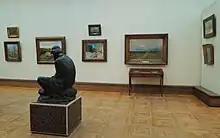 Vladimirka and four other Levitan works were exhibited at the Society for Travelling Art Exhibitions' twenty-first exhibition, which debuted in Saint Petersburg in February 1893 before moving to Moscow in March.[13][14] The landscape paintings in the exhibition received very little attention from Saint Petersburg critics; the only mention of Vladimirka was in the 47th issue of the Peterburgskaya Gazeta on 18 February 1893, where it was noted that Vladimirka had "the most unattractive 'grey' motives" and the author remarked, "What could be more boring than 'Vladimirka' by Levitan?"[15] More reviews of the painting appeared in the press after the exhibition was relocated to Moscow, the majority of which were complimentary; in particular, Vladimir Sizov (Russkiye Vedomosti), Vladimir Gringmut (Moskovskiye Vedomosti), and Mikhail Korelin (Russkaya mysl) all praised the work.[16]