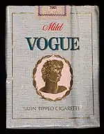 Vogue is a brand of cigarette, currently owned and manufactured by British American Tobacco.[1][2] Vogue is marketed primarily towards female customers as, "Female-branded packs are associated with a greater number of positive attributes including glamour, slimness and attractiveness. Furthermore, those looking at female-oriented cigarette packs branded with words such as “slim” and “vogue” are more likely to believe smoking helps people control their appetite compared with those viewing plain packaging."[3]