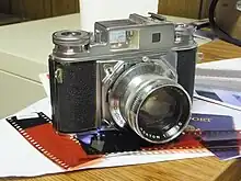 The "miniature" Prominent which takes 135 film was introduced in 1952 and produced until 1958, when it was succeeded by the ProminenT II, which was produced until 1960.[5] The original Prominent (135) included numerous detail improvements over its production run, mainly to minor items including the inclusion of strap lugs and a film reminder on the baseplate with later models; the Prominent II has a distinctive, larger Albada-type viewfinder and square rangefinder window, while the original Prominent has a smaller, rectangular viewfinder and round rangefinder window, although the camera bodies are basically the same. The earliest Prominent (135) has a Synchro-Compur shutter with a top speed of 1400 sec, which was updated to 1500 sec within a year.[6]