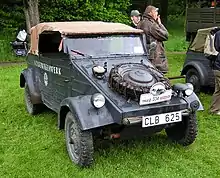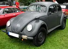 The Volkswagen Type 82 Kübelwagen (ⓘ), or simply Kübel,[2] contractions of the original German word Kübelsitzwagen (translated: 'bucket-seat car' — but when the contractions are translated literally a back-formation of 'bucket' or 'tub'-car results),[3] is a military light utility vehicle designed by Ferdinand Porsche and built by Volkswagen during World War II for use by the Nazi German military (both Wehrmacht and Waffen-SS). Based heavily on the Volkswagen Beetle, it was prototyped and first deployed in Poland as the Type 62, but following improvements entered full-scale production as the Type 82. Several derivative models, such as the Kommandeurswagen, were also built in hundreds, or in dozens.
