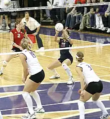 - Rotation Defense: A defensive formation of back row players where players "rotate" to cover a deep line shot. This formation closes the hole in the center of the court, but leaves space over the block in middle back for opposing attackers