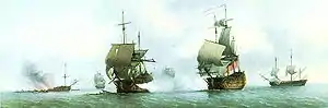Several days after unloading the cargo, while sailing to Cadiz for repairs, Glorioso was attacked successively near Cape St Vincent by four British privateer frigates and the ships of the line HMS Dartmouth and HMS Russell from Admiral John Byng's fleet. The Dartmouth was repeatedly hit and blew up, killing most of her crew, but the 92-gun Russell[4] eventually forced the Glorioso to strike the colours. The British took her to Lisbon, where she had to be broken up because of the extensive damage suffered during the last battle. The commander of the ship, Pedro Messia de la Cerda, and his men, were taken to Great Britain as prisoners of war, but were considered heroes in Spain and gained the admiration of the British. Several British officers were court-martialed and expelled from the Navy for their poor performance against the Spanish.[5][6]