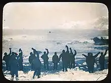 As his 27-man crew set up camp on the slowly moving ice, Shackleton's focus shifted to how best to save his party.[5] His first plan was to march across the ice to the nearest land, and try to reach a point that ships were known to visit.[6] The march began, but progress was hampered by the nature of the ice's surface, later described by Shackleton as "soft, much broken up, open leads intersecting the floes at all angles".[7]