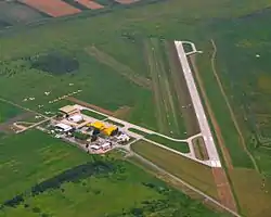 There are five hangars built at the airport which accommodate aircraft of the flight school and of the agricultural aviation division. An office building with classrooms and a control tower are adjacent to hangars and the concrete aircraft apron. Runway width is 25 m (82 ft).