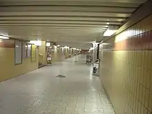 Since the construction of the new station building, it has been changed only slightly since its completion so that the basic structure of the original design is still preserved almost completely. In place of the wall paintings that have been removed there are now billboards. The former ticket office was converted into a travel center that was modified in the 1990s to fit the new corporate design of Deutsche Bahn. In addition, the entrance building now housed a baggage room, a "ServicePoint", a food shop, a book shop and a small kiosk for tobacco products and magazines. In the summer of 2006, two new sales pavilions were established for this purpose and an older bakery was removed and the ServicePoint had to be moved to the side of the hall. At the eastern end there was an office of the Bahnhofsmission charity, which provides assistance to travellers and the homeless; until the beginning of 2008, this has since been housed in the west wing of the building. Before the start of the platform underpass there is a toilet facility, which has been leased to a private operator since 2006. There have been repeated complaints in recent years regarding its cleanliness and hygiene to Deutsche Bahn, which notes, however, that a comprehensive renovation of the facility will be undertaken during the modernisation of the whole building.[8] The restaurant Bürgerstuben was housed in the western part of the building until June 2007. Its operation was terminated in October 2006 by the operator, SSP Deutschland, the successor to Deutsche Bahn's own catering operation Mitropa, in preparation for the planned station modernisation as part of the "arcades project" (Arcaden-Projekt, see below). Since Deutsche Bahn reversed the termination of the operation of the restaurant after the collapse of the arcades project, the reconstructed restaurant has been staffed by a new operator.[9] On the top floor in the western part of the building there is a conference centre and in the eastern part there are business premises. In mid-2007, work started on the establishment of a DB Lounge for first-class travellers and bahn.comfort (BahnCard) customers, which was forecast for completion in 2011.[10]