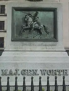 Worth's remains were originally deposited in Green-Wood Cemetery where they sat unburied for four years. In January 1855, a committee was established to design a suitable monument for General Worth. The monument was designed and built by James G. Batterson in 1857.[7] On November 25, 1857, Worth's remains were reinterred in the 51-foot granite monument on Worth Square on a traffic island between Fifth Avenue and Broadway at 25th Street in New York City's borough of Manhattan.[8] The Worth Monument is the second oldest monument in New York.