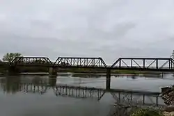 The Wabash Railroad Bridge is a historic structure located south of Pella, Iowa, United States. It spans the Des Moines River for 561 feet (171 m).[2] The Des Moines and St. Louis Railroad (D&S) was built through the central part of Marion County in 1882. This bridge was probably built at that time.[2] It is a three span, wrought iron, Pratt through truss manufactured by the Carnegie Steel Company. The Wabash, St. Louis and Pacific Railroad, the Wabash Railroad, eventually acquired the D&S and this bridge. It remained in use as a railroad bridge until about 1946 when the county acquired the bridge and the right-of-way for a county road. They rehabilitated it in 1951, replacing part of the substructure. The bridge was listed on the National Register of Historic Places in 1998.[1]