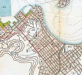 The waegwan of Dumo-po (두모포; 豆毛浦) is located in Jwacheon-dong, Busan. Established in 1607, 500 Japanese from Tsushima inaugurated the opening of the new settlement. It was also called kowakan (古倭館, 'old wakan') as the location of the waegwan was moved in 1678, over complaints that Jwacheon was too narrow and had a lack of dock facilities.[9] Tsushima-Fuchū oversaw the construction of facilities like Tōkō-ji (東向寺) temple, guest quarters, izakayas, and more, centered around a banquet hall, the Yŏnhyangdaech'ŏng (연향대청; 宴享大廳).[9]