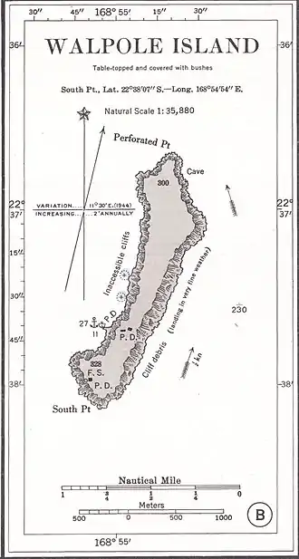 There is evidence that the island had prehistoric inhabitants. Graves, shell and bone tools, as well as stone markers indicate the presence of a permanent population at some point. The island is the topic of several oral traditions from Maré and the Île des Pines, the two closest inhabited islands. Speculation amongst the overseers of the Guano mining operation suggested that shipwreck or other castaways had also occupied the island.[1][2] British captain Butler is credited for discovery of the island in 1794 and he named it after his ship Walpole.[1]