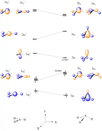 Six electron AH3 molecules should have a planar conformation. It can be seen that the HOMO, 1e’, of planar AH3 is destabilized upon bending of the A-H bonds to form a pyramid shape, due to disruption of bonding. The LUMO, which is concentrated on one atomic center, is a good electron acceptor and explains the Lewis acid character of BH3 and CH3+.[22]