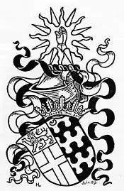 Coat of arms of Walter Blount as Clarenceux King of Arms: Clarenceux King of Arms impaling Blount, as for a Bishop, where the arms of the see impale the personal arms