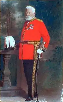 Goldsworthy was born in Marylebone, London. He travelled to India with his father, setting up a merchant business in Calcutta in 1854 and, together with his brother Sir Roger Tuckfield Goldsworthy (1839–1900), he joined the volunteer cavalry known as Havelock's Irregulars. During the Indian Mutiny of 1857, he won medals and was mentioned in dispatches. He was later commissioned into the 8th Hussars. In 1859 he was promoted lieutenant without purchase. In 1864, as a captain, he exchanged into the 91st Foot. In 1866 he was promoted brevet major and in 1868 he became a full major on half-pay. In 1874, still on half-pay, he was promoted brevet lieutenant-colonel and in 1880 brevet colonel. In 1882 he became lieutenant-colonel in the Essex Regiment. He was later promoted major general.[1] In 1897 Goldsworthy was receiving £ 466 per annum from the Indian revenues from annuities subscribed to while on service in India.[2]