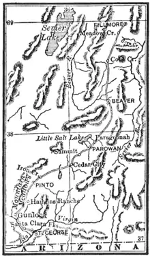 Young ordered pioneer settlements furthest afield to pull up stakes–evacuating colonies in San Bernardino (southern California), Las Vegas (southern Nevada), Carson Valley (western Nevada), and Fort Bridger (western Wyoming).[14] Thereafter, the farthest remaining outpost of Mormonism were the outlying Mormon colonies at Cedar City (led by Stake President-Major Isaac C. Haight) and Parowan (led by Stake President-Colonel William H. Dame), two infant fortress-villages near Mountain Meadows where the massacre took place. These settlements were nearly 300 miles from the Salt Lake City headquarters, and only reachable by a three days' journey on horseback, the messengers changing mounts at various settlements along the way.[15] Mormons in and around the Cedar City area were to be the first defense against an attack from the south which the Mormons feared and which the US Army was preparing for.[16][17] The word from Mormon headquarters was that the approaching U.S. Army had orders to murder every believing Mormon,[18] and that the troops were coming directly from Missouri,[19]