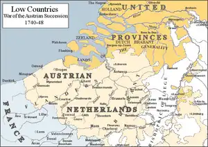 The Dutch Republic itself was now in danger. In April 1747, the French began reducing the Barrier Fortresses along the border with the Austrian Netherlands and invaded Dutch Flanders, which they swiftly captured. A general anger and panic broke out under the Dutch population, who still remembered the French invasion of 1672, and they demanded that William IV should be appointed stadtholder. The regents of Zeeland and Holland, fearing violence against them, soon appointed William stadtholder. The remaining provinces followed and by 10 May the Second Stadtholderless Period had ended. William was also appointed head of all the Dutch armed forces.[119] The strategic situation, however, failed to change and at Lauffeld on 2 July 1747, Saxe won another victory over a British and Dutch army under the Prince of Waldeck and Cumberland; the French then besieged Maastricht and Bergen op Zoom, which fell in September.[118] Although the Dutch States Navy was in the poorest condition it had ever been in, its positioning in the estuaries and rivers of Zeeland and Holland, however, prevented French incursions into those provinces.[120]