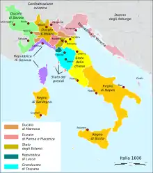 ![]() Italy in 1600. Montferrat is portrayed as part of Mantua. | |||||||||