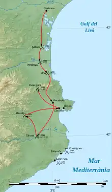 In the summer of 1285, the French crusader army under Philip and Charles of Valois entered Roussillon. Contemporary chronicles listed a huge force of between 80,000 and 100,000 men, while more modern sources estimate the size of the army as being around 1,500 mounted cavalry and 6,500–8,000 infantry.[22][23] Regardless of size, sources have described the army as one of the largest assembled by France in the 13th century, possibly the largest French expedition into Iberia since the time of Charlemagne.[22] Though the French had James of Majorca's support, the local populace rose against them and did not allow a quick French passage. When the French army reached the city of Elne, the city refused to open its gates. Elne was valiantly defended by the so-called bâtard de Roussillon ("bastard of Roussillon"), the illegitimate son of Nuño Sánchez, late count of Roussillon. Eventually the city was overcome and brutally sacked, with the French then continuing their advance south. Local nobles conducted a scorched earth campaign against the French, prompting Philip to order his army to isolate any Aragonese garrison they encountered and continue south quickly, fearful of running out of supplies. Peter and the Aragonese army fell back from the frontier, not willing to risk attacking the larger French army - Peter was also awaiting the return of the men and ships he had fighting in Sicily.[3][20]
