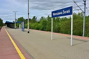 Warszawa Żerań railway station is a railway station in the Białołęka district of Warsaw, Poland. As of 2012, it is used by Koleje Mazowieckie, who run the KM9 services from Warszawa Wola or Warszawa Zachodnia through the north of the Masovian Voivodeship to Działdowo, in the Warmian-Masurian Voivodeship via Legionowo, Nasielsk, Modlin, Ciechanów and Mława, at all of which some trains terminate, and by Szybka Kolej Miejska, who run S9 services to Wieliszew, with some trains terminating at Legionowo or Legionowo Piaski.