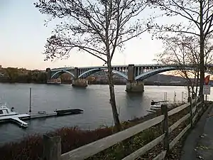 The Washington Crossing Bridge, commonly known as the Fortieth Street Bridge, is an arch bridge that carries vehicular traffic across the Allegheny River between the Pittsburgh neighborhood of Lawrenceville and the suburb of Millvale.[2][3][4] The bridge is decorated with the seals representing the original 13 colonies of the US and that of Allegheny county.[5]