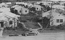 Covering an area of 924,000 square meters, Washington Heights was home to 827 housing units for United States Army Air Force and, later, Air Force families. It also hosted support facilities, including schools, churches, theaters, shops, and officers' clubs. Japanese citizens were not permitted to enter the area, which was fenced in with multiple gates.[1] Washington Heights was predominantly a middle-class area,[2] although much of Tokyo had been devastated by firebombing during the war.