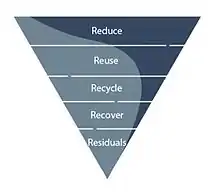 The waste hierarchy describes the priorities linked to the waste management via a preferential order, on the basis of the efficiency of each of its strategies towards the production, use and disposal of a product.[62] It is often represented as an inverse pyramid, grading from the top "most preferable" to the bottom "least preferable" solutions.[62] The waste hierarchy sets efficiency as an aim, and over-consumption as an avoidable, unnecessary occurrence that can be diverted by appropriate changes in the consumer behaviour.[62]