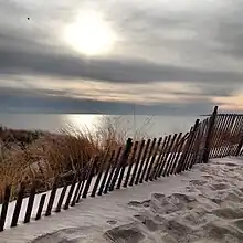 Fort Road connected Watch Hill to Fort Mansfield, but the hurricane of 1938 wiped it out and destroyed 39 houses, the Yacht and Beach Clubs, and a bathing pavilion. Fifteen people were killed and others survived by clinging to wreckage, as they were swept across the bay to Connecticut.[5] Several breachways were created in Napatree Point after the hurricane passed. Sandy Point remains an island, rather than the northern extension of Napatree. The shortened Napatree Point is now a barrier beach without any roads or houses. It is open to the public, and offers bird watching and surf casting.