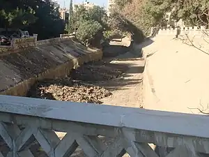Surface and groundwater in the Barada basin is polluted by industrial and domestic wastewater, as well as by agricultural non-point sources such as fertilizers and pesticides. Much of the wastewater generated from industrial activities in Greater Damascus is discharged into the environment, mainly to the Barada River, without prior treatment. The uncontrolled disposal of toxic, chemical products, primarily from lead industries and battery manufactories, has also resulted in severe soil pollution.[8] There is no pre-treatment of industrial wastewater discharged into the sewer network. As a result, the largest wastewater treatment plant of Damascus in Adra frequently malfunctions. Measured concentrations of biological oxygen demand (BOD), a measure of organic water pollution, exceeded the allowed limits in most of the branches of the Barada River.[8] According to the Syrian National Environmental Action Plan of 2003, concentrations of BOD and ammonia in the Barada River exceeded Syrian Standards for 86% of collected samples between 1995 and 2000. Well and spring water in the basin is bacteriologically contaminated because of sewage discharge. The concentrations of nitrates in some wells in the Ghouta exceeded the limits set by the drinking water standards. Because of discharges by tanneries concentrations of Chromium III reach 10 mg/liter in Al Daiyani River and exceed the allowable limits tenfold in the wells of Al Zablatini area, all located in the Barada basin.[9] Surface water pollution reduces real estate values next to the river and its branches, as well as the recreational value of the river. It also damages fishery, aquaculture and biodiversity, in addition to its health impacts.[8]