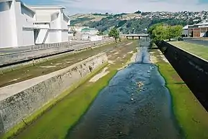 The lower reaches of the Leith are contained within engineered, canal-like concrete channels. These, and the various weirs located in the Leith's stream—notably just to the north of Woodhaugh Gardens, were built to prevent a repeat of the serious damage to Dunedin North by the highest recorded flood in March 1929.[4] An earlier devastating flood occurred on the river in 1868.[1] The original course of the Leith was, in fact, a meandering track through what is now the central city, emptying into the upper harbour where Cumberland and Stuart Streets now meet.