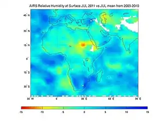 Studies predict that by the year 2050 the rainfall in Sub-Saharan Africa could drop by 10%, which will cause a major water shortage. This 10% decrease in precipitation would reduce drainage by 17% and the regions which are receiving 500–600 mm/year rainfall will experience a reduction by 50–30% respectively in the surface drainage.[33] Additionally, the Human Development Report predicts warming paired with 10% less rainfall in interior regions of Africa, which will be amplified by water loss due to water loss increase from rising temperature.[23] Droughts and floods are considered to be the most dangerous threat to physical water scarcity.[34] This warming will be greatest over the semi-arid regions of the Sahara, along the Sahel, and interior areas of southern Africa.[23]